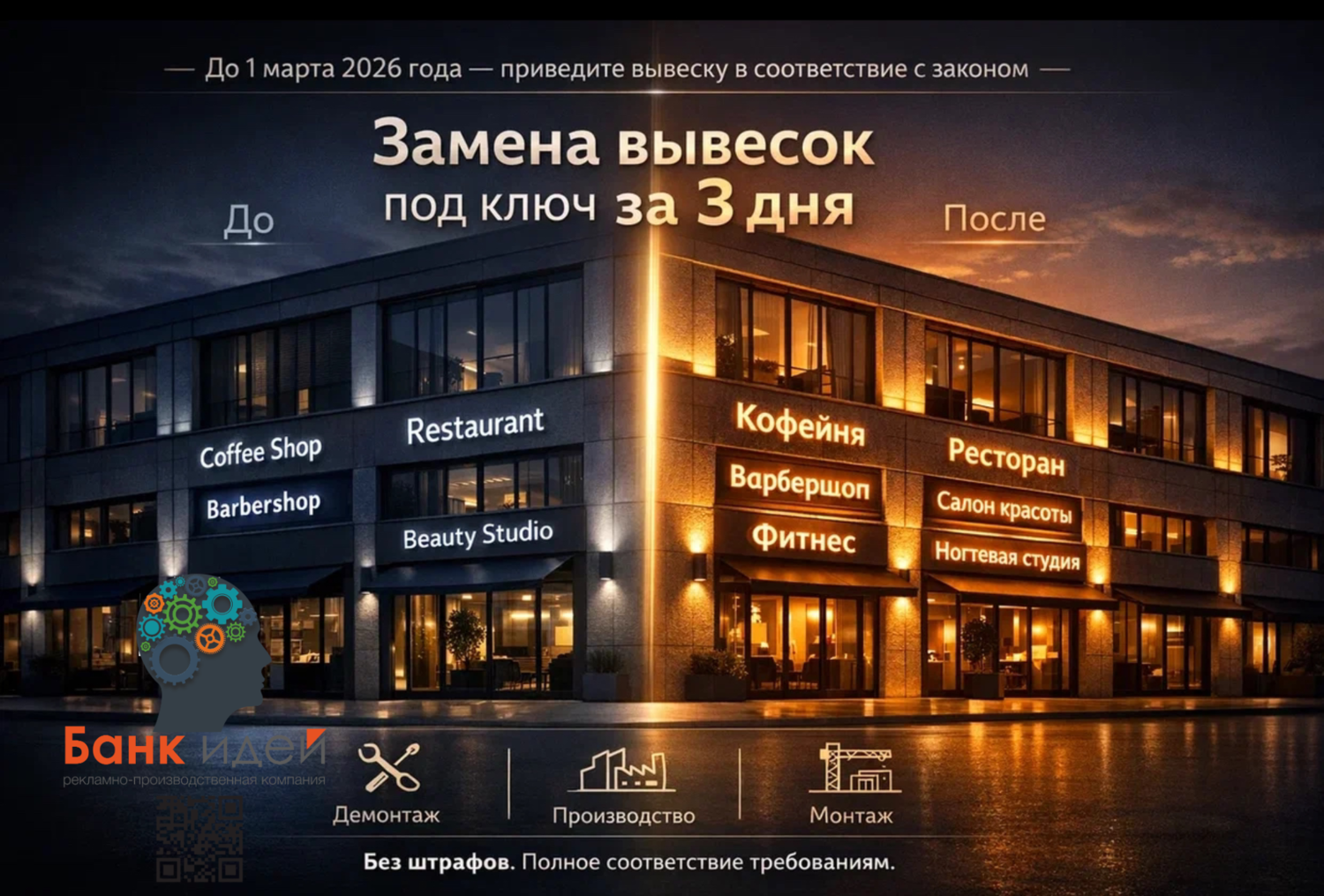 Согласно новому закону № 168-ФЗ, вступающему в силу с 1 марта 2026 года, потребуется обновить все ранее установленные рекламные конструкции и вывески таблички световые короба и указатели , чтобы обеспечить соблюдение новых требований.
